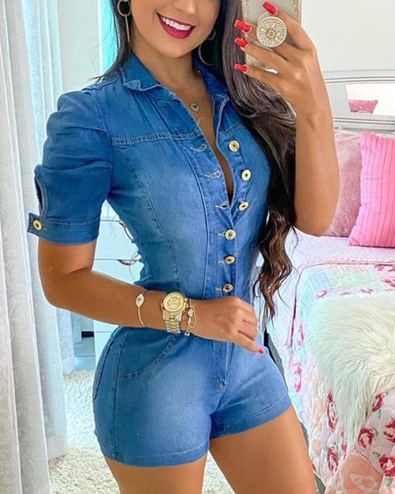 Puff Sleeve Button Front Denim Romper, Blue