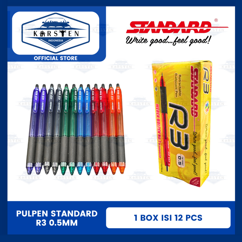 Standard R3 adalah nama merek dan tipe sebuah pulpen (pena) yang diproduksi oleh perusahaan bernama Standard. Pulpen ini dikenal dengan tinta hitamnya yang berkualitas, mata pena 0.5 mm tip point yang nyaman untuk menulis, dan kemampuannya memberikan pengalaman menulis yang sangat halus (super smooth).