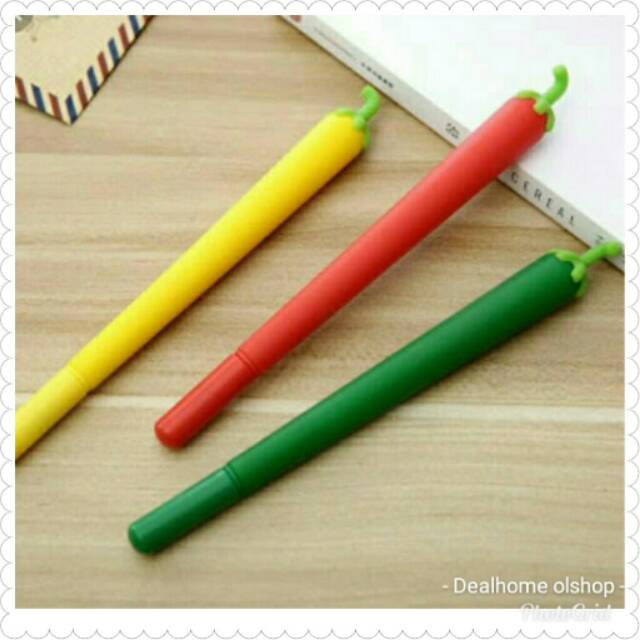 Pulpen bentuk cabe ini. Lucu banget. Isi gel. Warna random. Minimal order 1 lusin. 1 kg muat 6 lusin box mika.