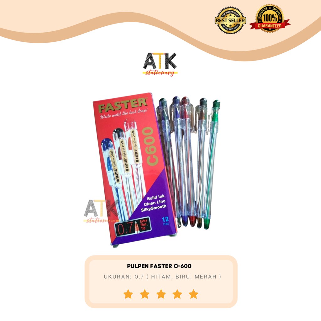 *Pulpen faster C600 merupakan pulpen yang sangat sering digunakan olehpara user karena kualitasna yang tinggi, anti kering serta design yang unik dan belang belang berwarna membuat para user lebih semangat dalam menulis.