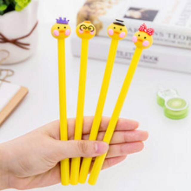 Pulpen tinta hitam dengan bahan plastik mulus. Varian ayam berkacamata, ayam berpita, ayam bermahkota, dan ayam bertopi