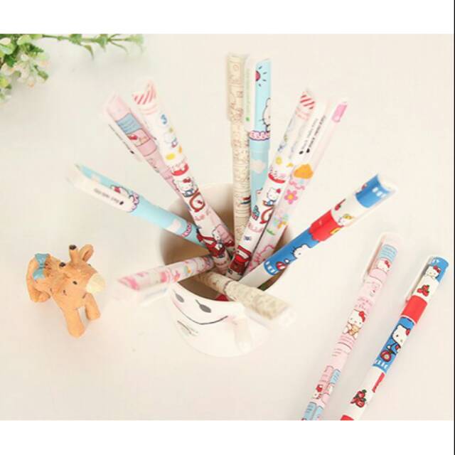 Pulpen Gel Set Hello Kitty ini dalam 1 set terdiri dari 6 buah pulpen Gel tinta Hitam. Mata pulpen 0.38mm. Panjang pulpen kira-kira 15,5 cm.