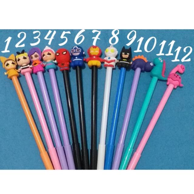 Pulpen karakter bisa pilih model dari nomor 1 s/d 12, tapi untuk warna akan dikirim random sesuai stock yang ada, membeli berarti setuju.