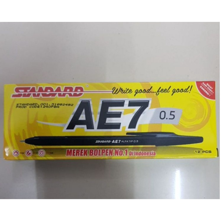 Pulpen standart ae 7 , hanya tersedia hitam , ASLI (segel gel di ujung pulpen dan tempat isi tinta bergaris berlogo standart) , harga tertera per lusin isi 12 Pcs