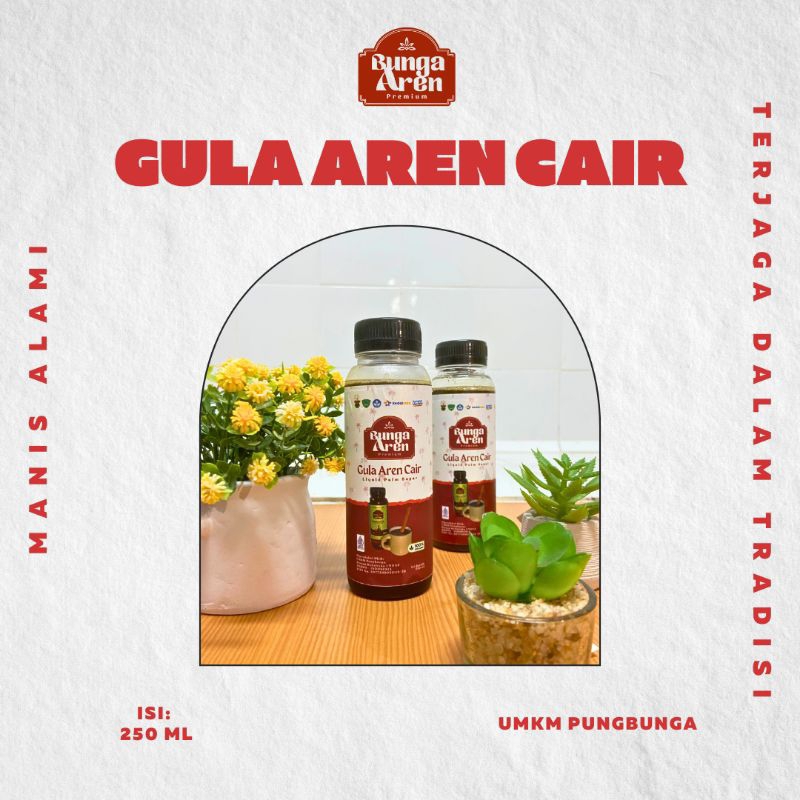 Gula aren cair Bunga Aren merupakan produk olahan nira aren pilihan dari pohon aren di pengunungan Tompobulu. Dibuat secara tradisional dengan mempertahankan kemanisan alami dari gula aren. 100% organik. Cocok untuk isian dalam pembuatan berbagai jenis kue serta dalam berbagai jenis minuman. Memiliki indeks glikemik lebih rendah dari gula pasir, cocok untuk yang ingin sehat.