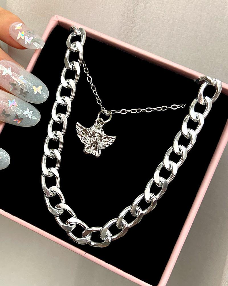 Punk Layered Chain Angel Pattern Pendant Necklace, Silver