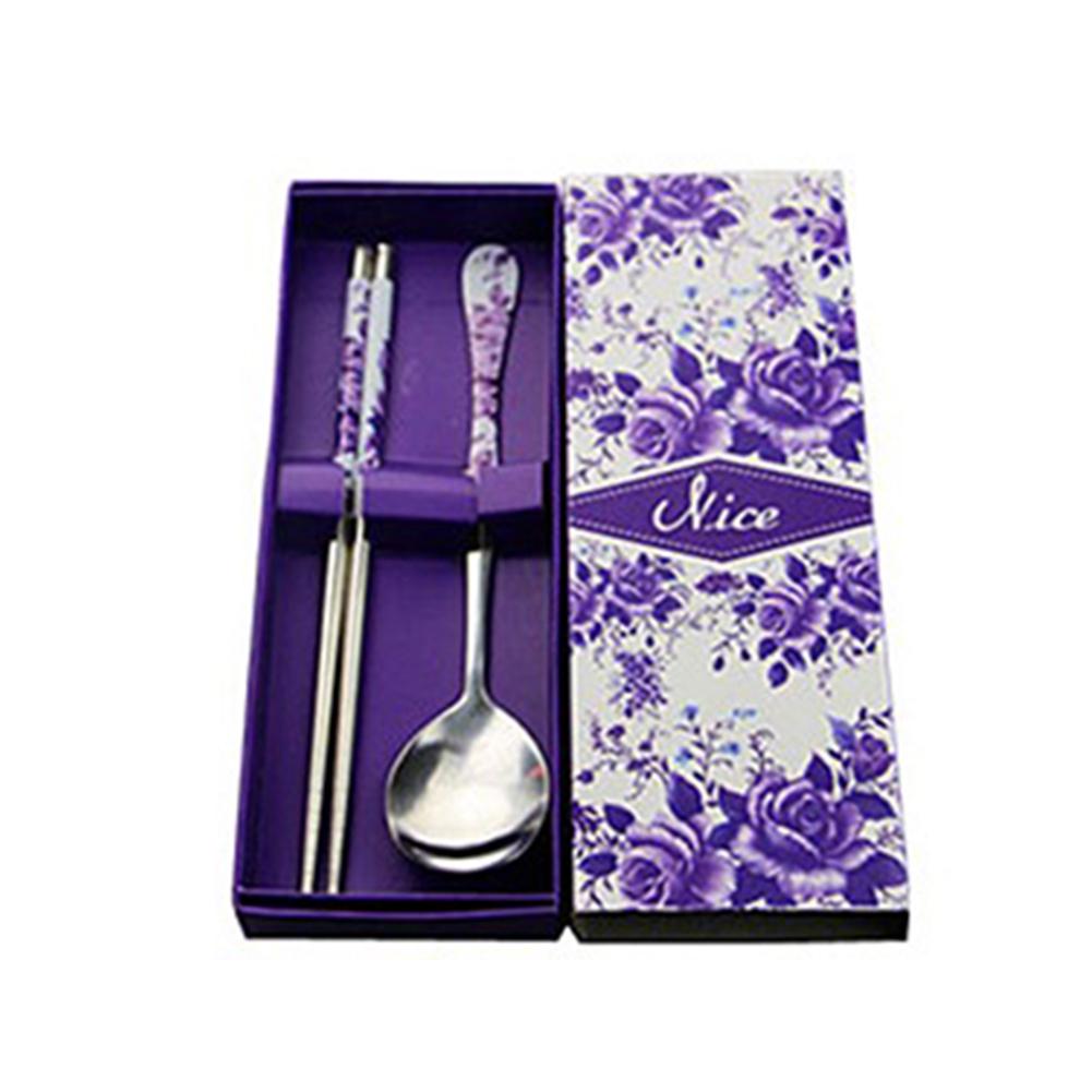 Puntos 2 шт., набор посуды из нержавеющей стали, синие и белые фарфоровые палочки для еды, ложка фиолетовый