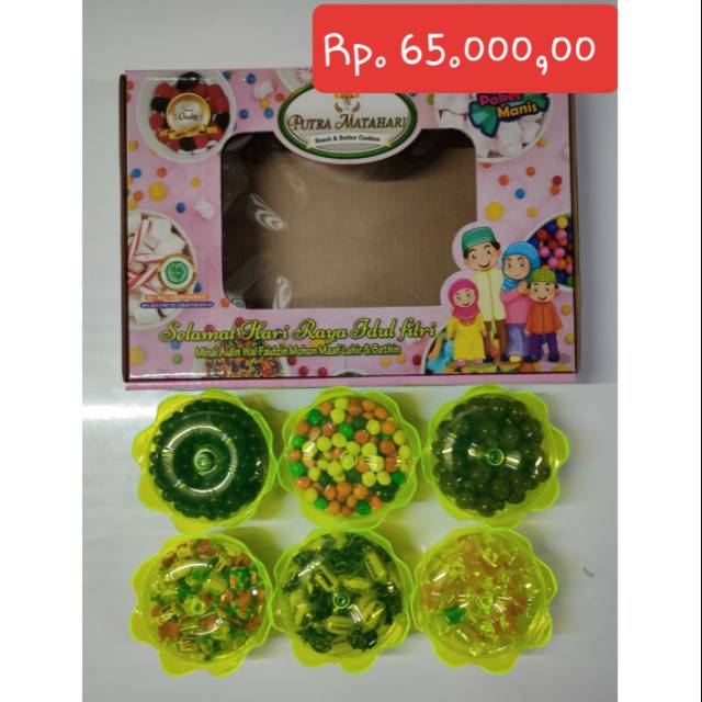 Putra Matahari paket manis harga Rp 65.000. isi 6 toples permen. Semua toples masuk dalam kemasan dus.