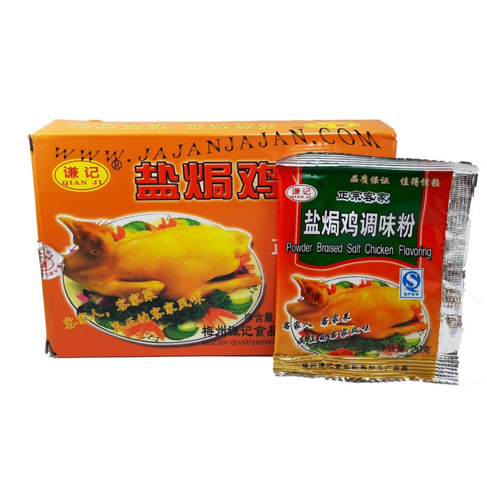 Bumbu ayam garam atau Yan Ju Ji Pei Liao ( Powder braised Salt Chicken Flavoring ) merk QIAN JI....cara modern untuk membuat ayam garam....lebih praktis cara membuatnya dan yang pasti lebih enak rasanya....1 kotak isi 10 bks @ 20gr/bks .....