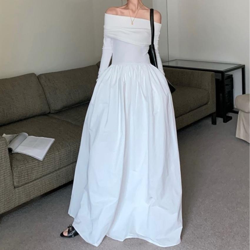 Белое платье QICED Pure Desire A Word с открытыми плечами и длинными рукавами, женское, весна-осень, французское, в стиле Хепберн, длинное платье XL белый