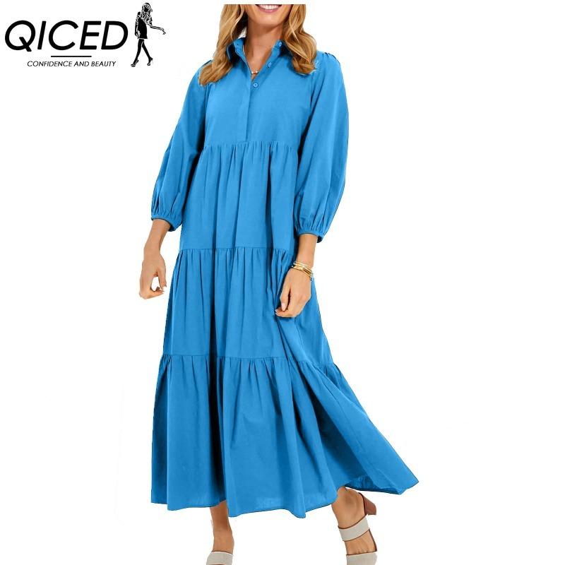 QICED Женская мода Весна Осень Однотонный принт Длинный рукав Воротник ПОЛО Завышенная талия Повседневные платья M синий