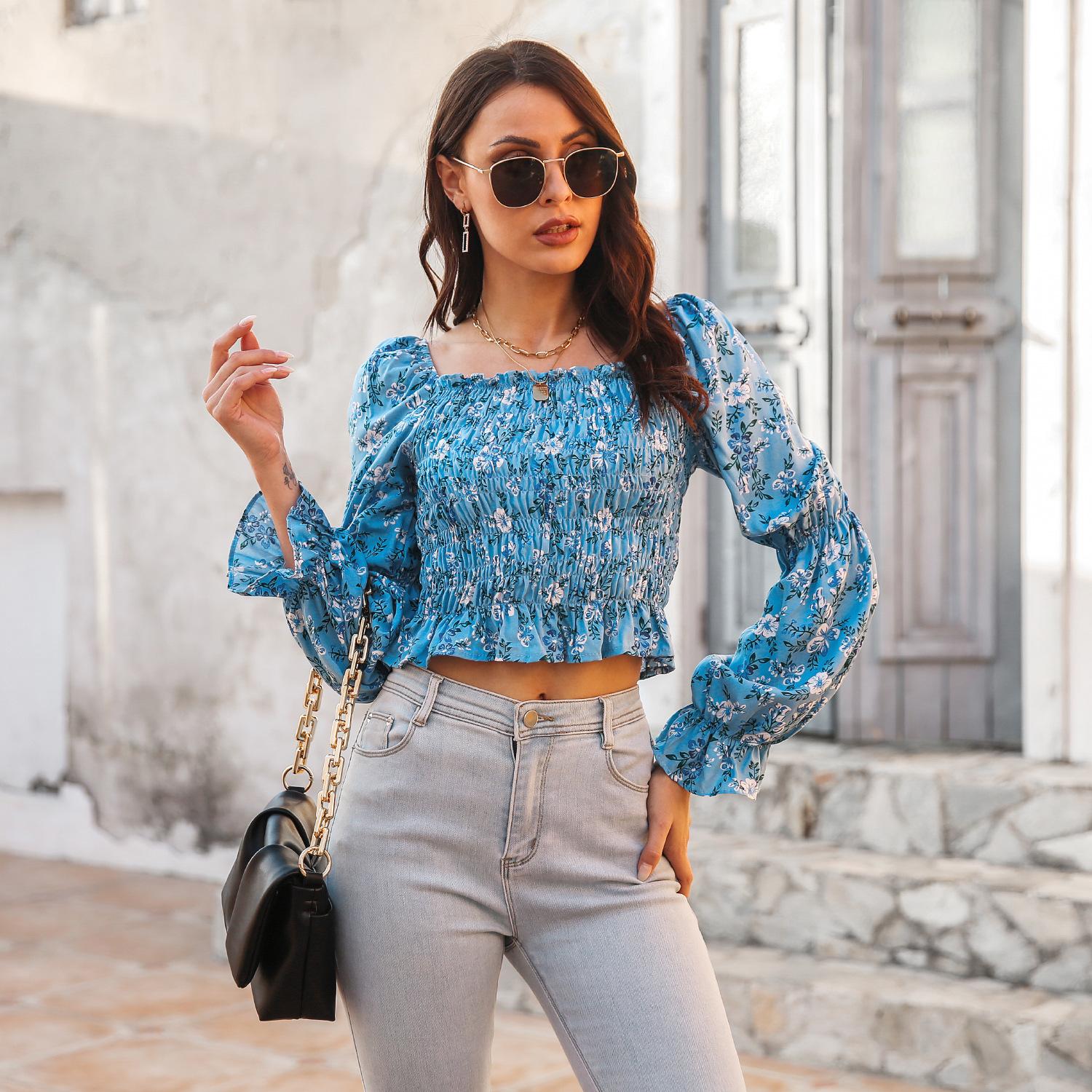 QICED женские модные повседневные осенне-зимние блузки и рубашки с квадратным воротником и короткими рукавами с цветочным принтом XL синий