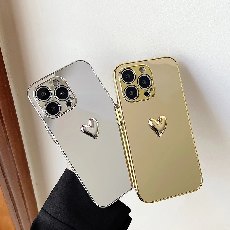 Qianliyao 3D Silver Golden Heart Shockproof Electroplated Case for iPhone 16 15 14 13 12 Pro Max 11 X XR XS 7 8P Hard Back Cover