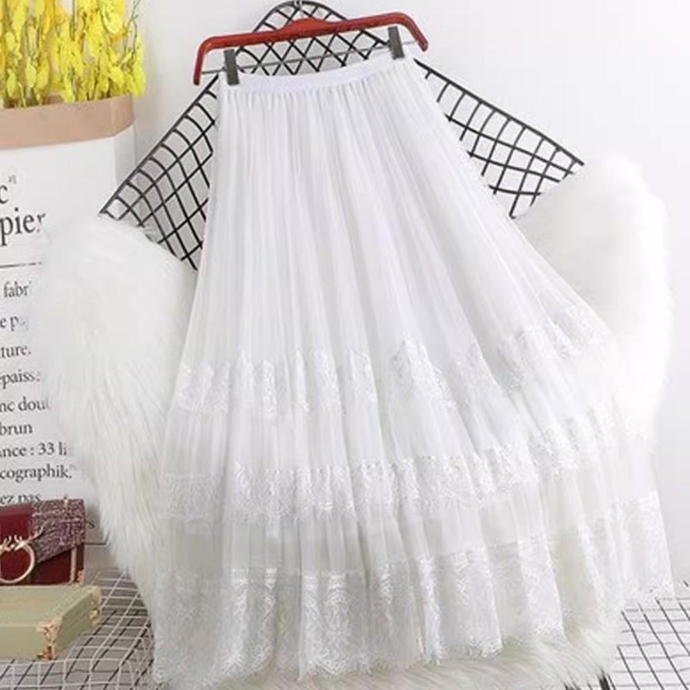 Qooth Женская юбка А-силуэта из тюля и кружева с плиссировкой, широким подолом, средней длины, на резинке, повседневная юбка QT2649 One Size белый