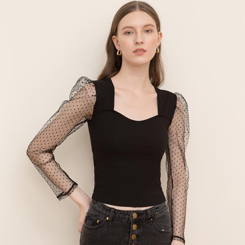 Qooth женский кружевной топ с квадратным вырезом и объемными рукавами, повседневная модная элегантная тонкая сетчатая рубашка на весну и лето QT2074 S чёрный