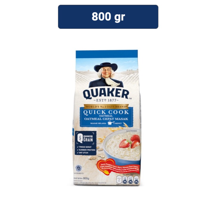 Quaker Quick Cooking Oatmeal 800 Gr KEBAIKAN Oatmeal 1. Quaker terpercaya menjadi merk oatmeal nomor 1 di dunia. 2. Terbuat dari 100% oat utuh Australia. 3. Dengan Kebaikan oatmeal Tinggi serat, membantu menurunkan kadar kolesterol darah dan menjaga fungsi saluran pencernaan. KETERANGAN CARA PENYAJIAN 1. Cepat saji 2. Campurkan 4 sendok makan Quaker(35 gram) dengan 210 ml air panas atau susu rendah lemak , cukup dimasak 3 menit 3. Dapat Dikonsumsi setiap saat dengan topping yang kamu suka : buah-buahan , madu, susu , abon dll