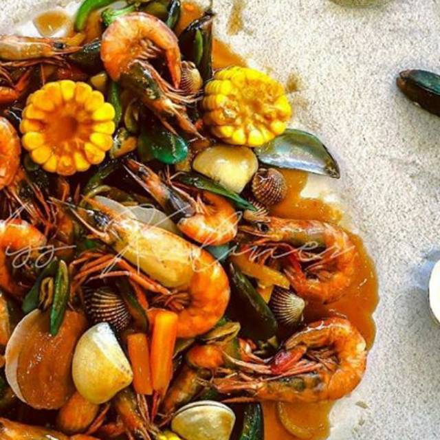 udang ditambah mix kerang (kerang darah, kerang hijau, kerang simping, kerang kepah), ditambah sayuran (jagung,wortel, brokoli, kembang kol)