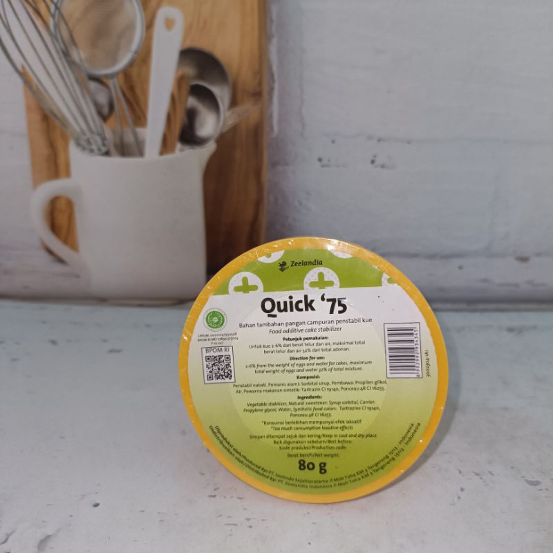 Quick 75 adalah emulsifier terkenal yang sering digunakan dalam pembuatan kue dan bolu di Indonesia. Fungsinya adalah untuk meningkatkan tekstur, keempukan, dan volume kue, serta memperpanjang masa simpan.