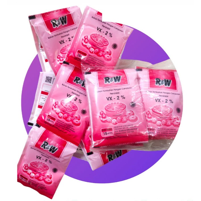 R&W VX - 2 % adalah bahan untuk mengembangkan adonan segala roti,kue kering,kue basah,atau segala bahan pengempuk,dll.