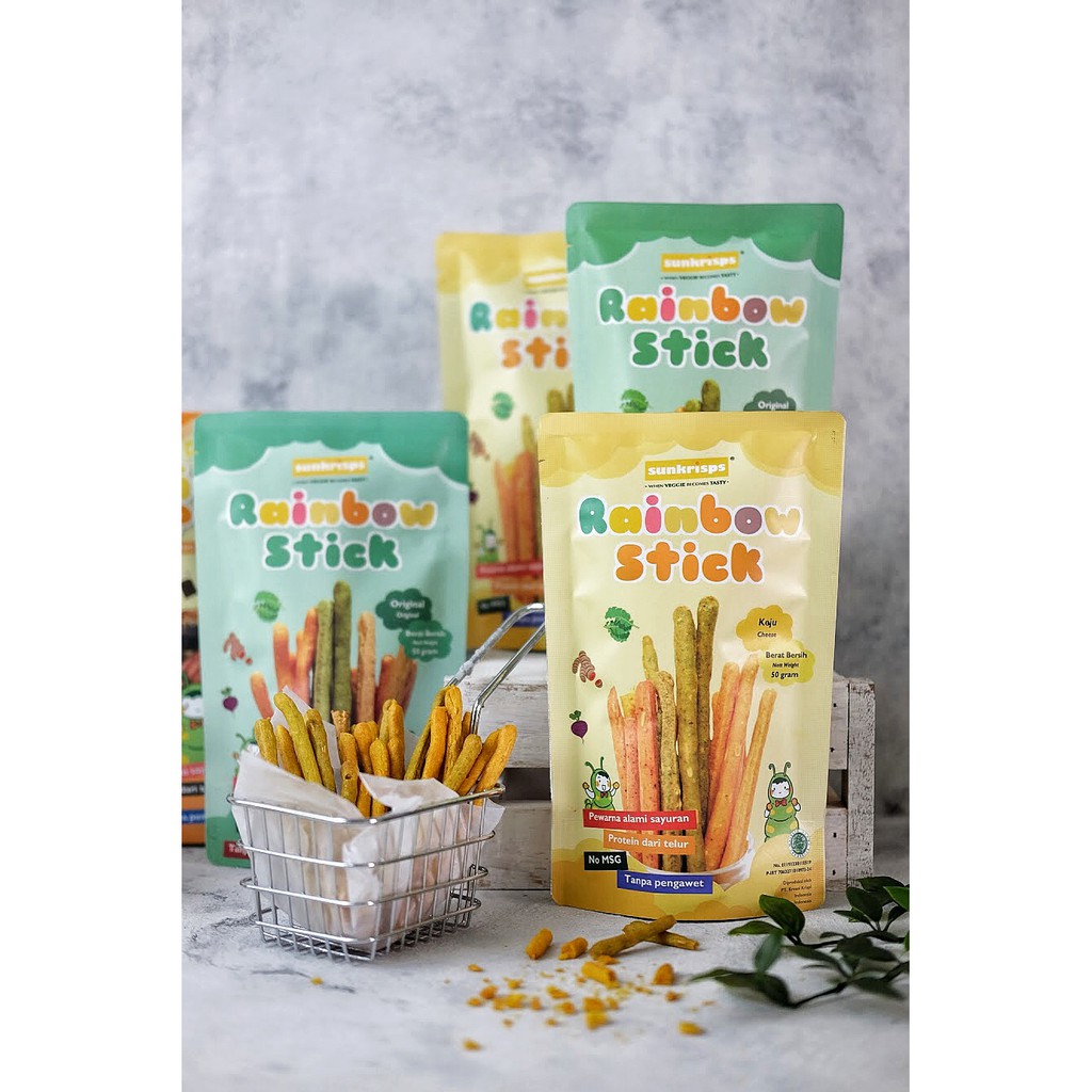 Rainbow Stick menggunakan Pewarna Alami Sayuran yaitu Bit, Kale dan Kunyit. Bahan-bahan alami natural dan cocok untuk jadi cemilan si kecil. Serta, tanpa menggunakan MSG dan Pengawet!.