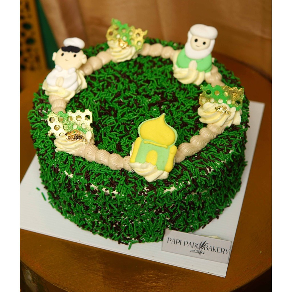 Soft pillow cake pandan diselimuti dengan cream cheese dan dilapisi oleh meses coklat dan hijau full disekeliling kue, dan didekorasi dengan edible icing piping & white chocolate diatasnya