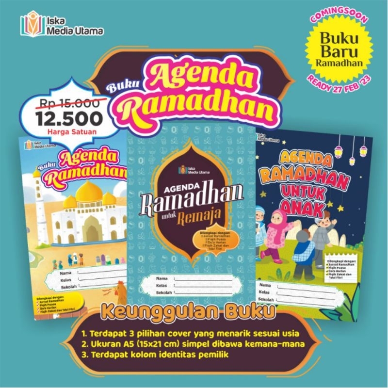 Kali ini kami menerbitkan buku *Agenda Ramadhan* dengan kemasan lebih ekonomis, ada 3 pilihan design sampul untuk Kids, Junior, dan Remaja.