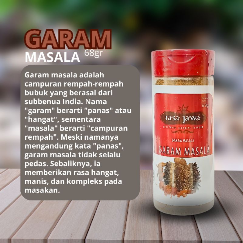 Garam Masala adalah produk bumbu dapur yang berasal dari Rasa Jawa. Garam Masala adalah bumbu yang terbuat dari campuran rempah-rempah seperti cengkeh, kapulaga, kayu manis, dan lain-lain. Bumbu ini memberikan rasa yang kaya dan aroma yang khas pada masakan.