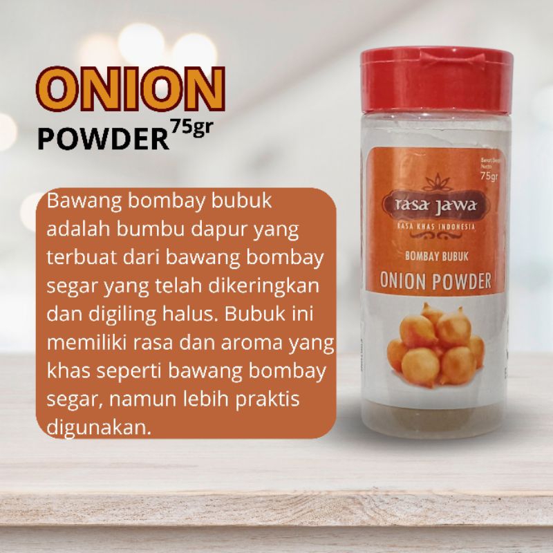 Onion Powder adalah produk bumbu dapur yang dapat memberikan rasa dan aroma yang khas pada masakan. Produk ini berasal dari Rasa Jawa, merek yang terkenal dengan produk-produk bumbu dapur berkualitas tinggi. Onion Powder dapat digunakan sebagai bahan tambahan pada masakan untuk memberikan rasa dan aroma yang khas.