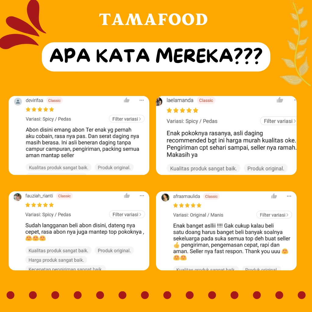 Abon Sapi merupakan makanan ringan atau lauk yang siap saji terbuat dari bahan daging sapi pilihan terbaik dan rempah-rempah tradisional tanpa pengawet dan tanpa pewarna. Diolah secara higienis sehingga menghasilkan rasa yang gurih, nikmat dan lezat.