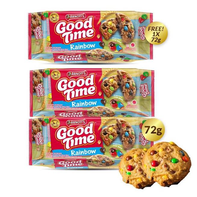 Biskuit renyah bertabur chococips lezat dan permen cokelat warna-warni. Terbuat dari bahan berkualitas dan rasa yang lezat sehingga disukai jutaan keluarga di Indonesia. Hadirkan kebahagiaan bagi momen bersama keluarga anda dengan biskuit Good Time favorit keluarga.