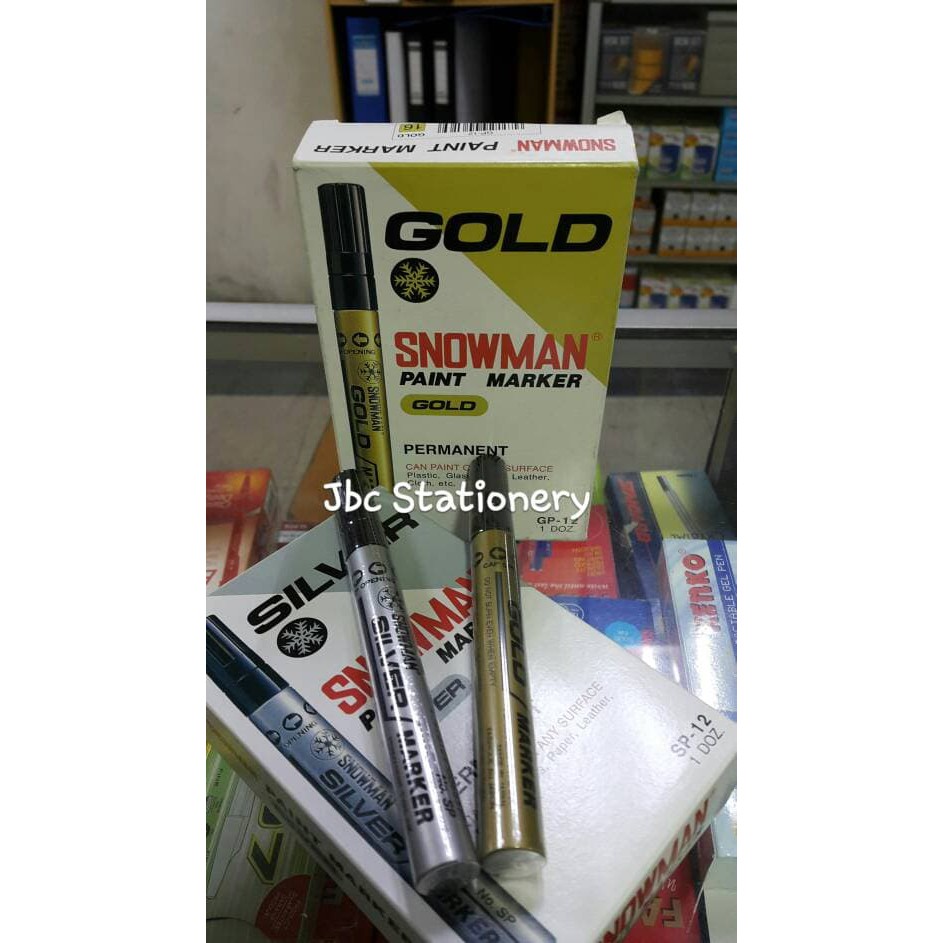 spidol permanent (tidak bisa dihapus) merk snowman warna emas , silver dan putih.