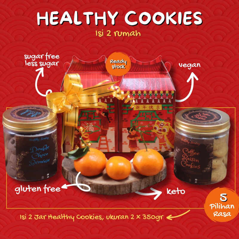 2 Box Rumah Imlek isi 2 Healthy Cookies ukuran jumbo Kar 350 x 2. Free : Paper Belt, Pita, Kartu Ucapan dan hang tag imlek. Tersedia 5 Pilihan Rasa, Sugar free or Less sugar, Gluteb free, Vegan, low fat, Low calories, keto (Options Are Available)