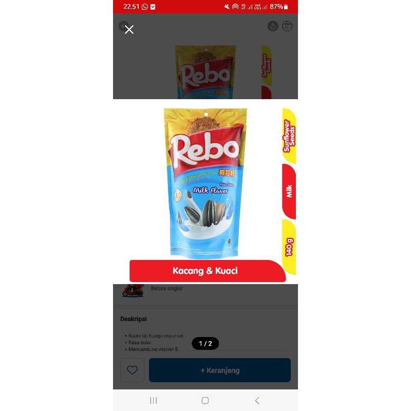 Rebo Kuaci Biji Bunga Matahari Milk merupakan kuaci siap makan yang ideal untuk menjadi teman camilan yang seru. Dibuat dari biji bunga matahari pilihan dan paduan rempah-rempah berkualitas, serta diolah secara higienis menggunakan teknologi modern untuk menciptakan camilan kuaci yang gurih dan nikmat. Selain memiliki rasa original yang gurih, kuaci ini mengandung Vitamin E yang baik untuk kesehatan kulit. Dikemas praktis dalam kemasan pouch membuatnya praktis untuk dinikmati saat kumpul bersama teman dan keluarga. Nikmati perpaduan rasa biji bunga matahari dan susu yang unik dan rasakan keseruan menjalani hari bersama dari Rebo Kuaci Biji Bunga Matahari Milk.