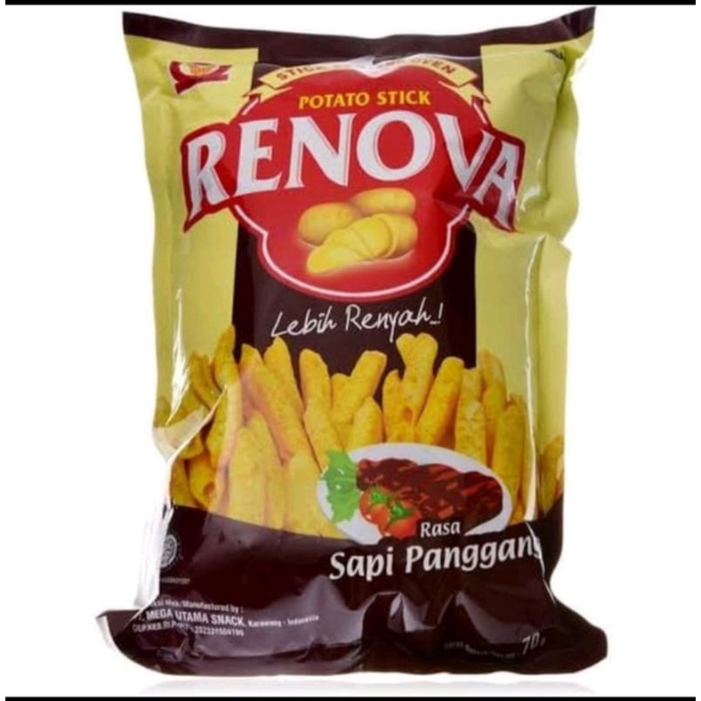 Renova sapi panggang 70gr merupakan cemilan dari kentang pilihan yg di buat dan di kemas secara higienis untuk menghasilkan rasa yg enak dan berkualitas.