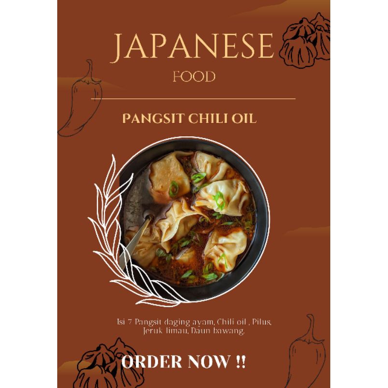 Pangsit Chilli Oil terdiri dari pangsit yang direbus dan disajikan dengan minyak cabe pedas diatasnya.
