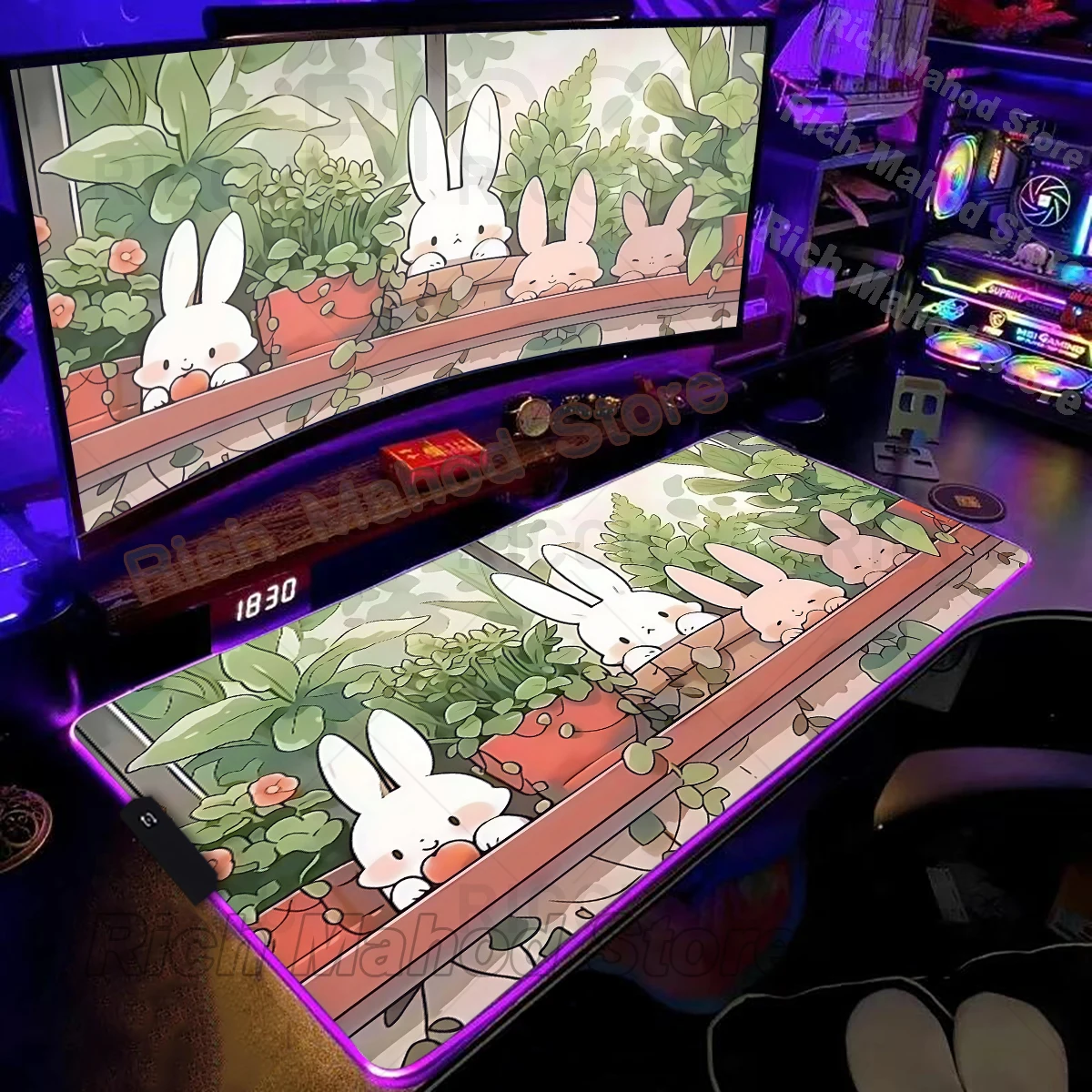 RGB Mousepad LED Green Plants Cute Rabbit Mouse Pad E-sports Gaming Accessories Extended Keyboard Carpet XXL Anime Desk Mats Rug