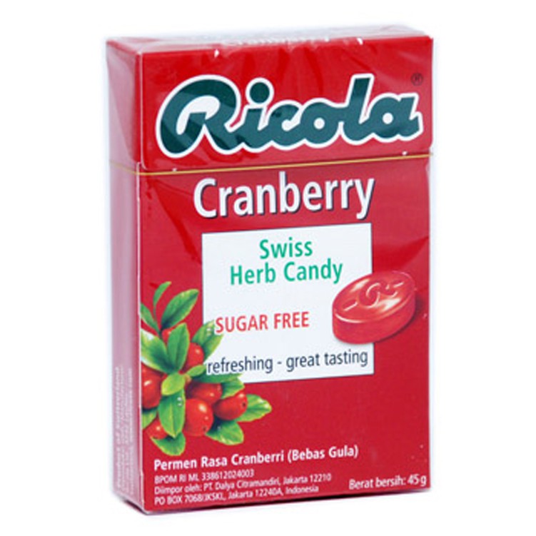RICOLA Permen Cranberry 45 gr,Terlalu banyak mengkonsumsi gorengan dan meminum air es membuat tenggorokan menjadi tidak nyaman. Cara sederhana untuk mengatasi itu, permen mint biasanya dipilih untuk menyegarkan tenggorokan. Permen mint yang dapat Anda pilih adalah Ricola Permen Cranberry 45 gr. Permen mint herbal Ricola ini hadir dengan rasa Cranberry yang segar dan nyaman di tenggorokan. Terbuat dari bahan-bahan herbal pilihan dan diproses secara modern untuk menghasilkan permen dengan sensasi mint yang menyegarkan. Rasa mint permen Ricola memberikan rasa sejuk dan sensasi melegakan sehingga dapat membantu melegakan tenggorokan dan menenangkan batuk. Selain menyejukan, permen ini pun aman dikonsumsi karena tidak mengandung gula. Datang dalam kemasan praktis 45 gr yang dapat Anda bawa ke mana saja dan dikonsumsi saat dibutuhkan.