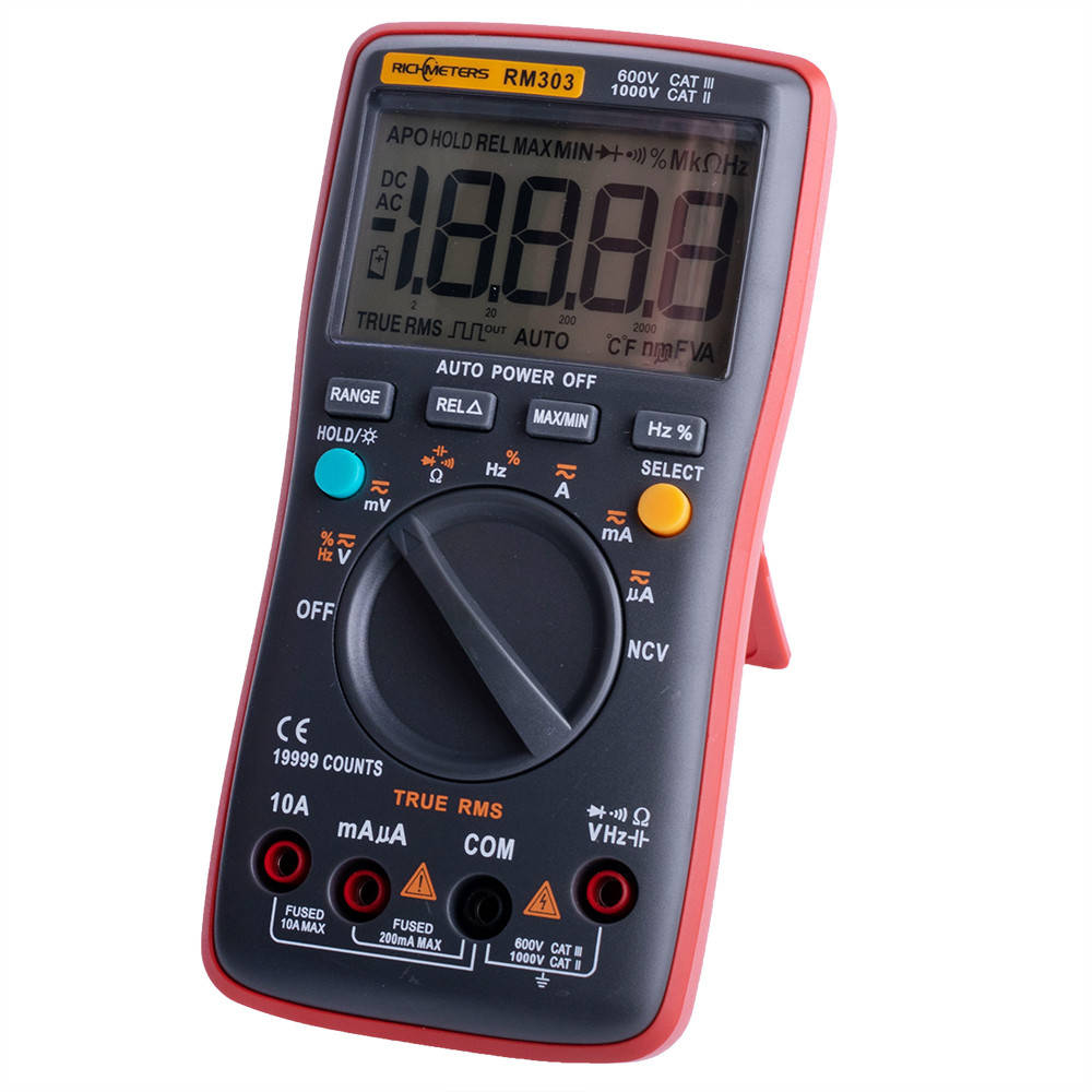 В наличии 4 штГруппа: МультиметрыОписание : Цифровой мультиметр TRUE RMS с NCV. Разрядность шкалы мультиметра: 19999 отсчетов. Постоянное/переменное напряжение: 19,9m/199,9m/1,99V/19,9V/199,9V/1000VDC(750VAC),постоянный/переменный ток: 199,9µA/1999,9µA/199,9mA/19,9mA/1,9A/10A, сопротивление: 199,9/1,99K/19,9K/199,9K/1,9M/19,9M/199,9M, измерение ёмкости: 9,9nF/99,9nF/999,9nF/9,9µF/99,9µF/999,9µF/9,9mF,измерение частоты: 99,99Hz-9,99Mhz,скважность:1~99%, MAX/MIN значения. Прозвонка соединений, тест диодов, подсветка, удержание данных. Питание: 2xAA. Габариты: 161x81x39 ммИзмерение частоты: 10 Hz...10 MHzИзмерение напряжения и тока: 19,9 mV...1000 V/ 19,9 mA...10 AИзмерение сопротивления: 200 Ohm...200 MOhmИзмерение индуктивности: нет