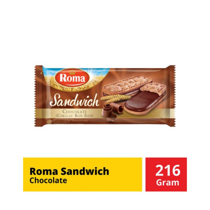Roma Sandwich Choco 216g camilan biskuit baru persembahan Roma yang hadir dengan rasa cokelat yang manis, dan renyah. Cocok untuk dijadikan camilan sehari-hari pada saat berkumpul dengan keluarga.