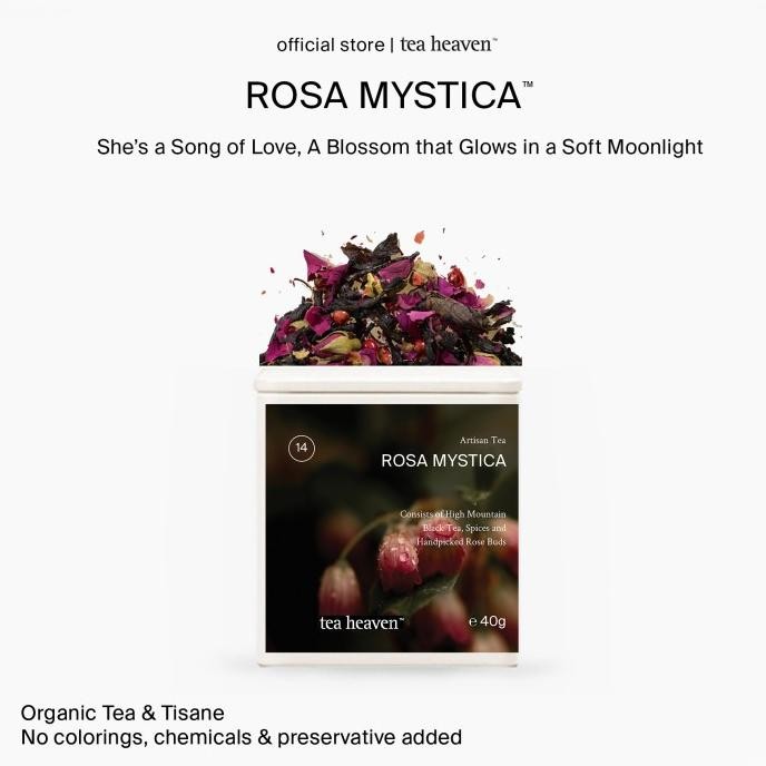 Special Edition Valentine's DayTea Heaven SignatureROSA MYSTICAIngredients : High Mountain Black Tea, Peppercorn & Rose BudsSmooth silky black tea with floral aroma and slighty sweet tasteNet weight : 40 GramBeberapa manfaat teh hitam mawar antara lain dapat meningkatkan sistem kekebalan tubuh, anti peradangan, kaya antioksidan, mengurangi stres dan kecemasan, melancarkan pencernaan dan meningkatkan kesehatan kulitBrewing Guide : 1-2 gram (1 tsp) / 200ml / 90'C / 3-5 minutesPIRT & HALAL Certified