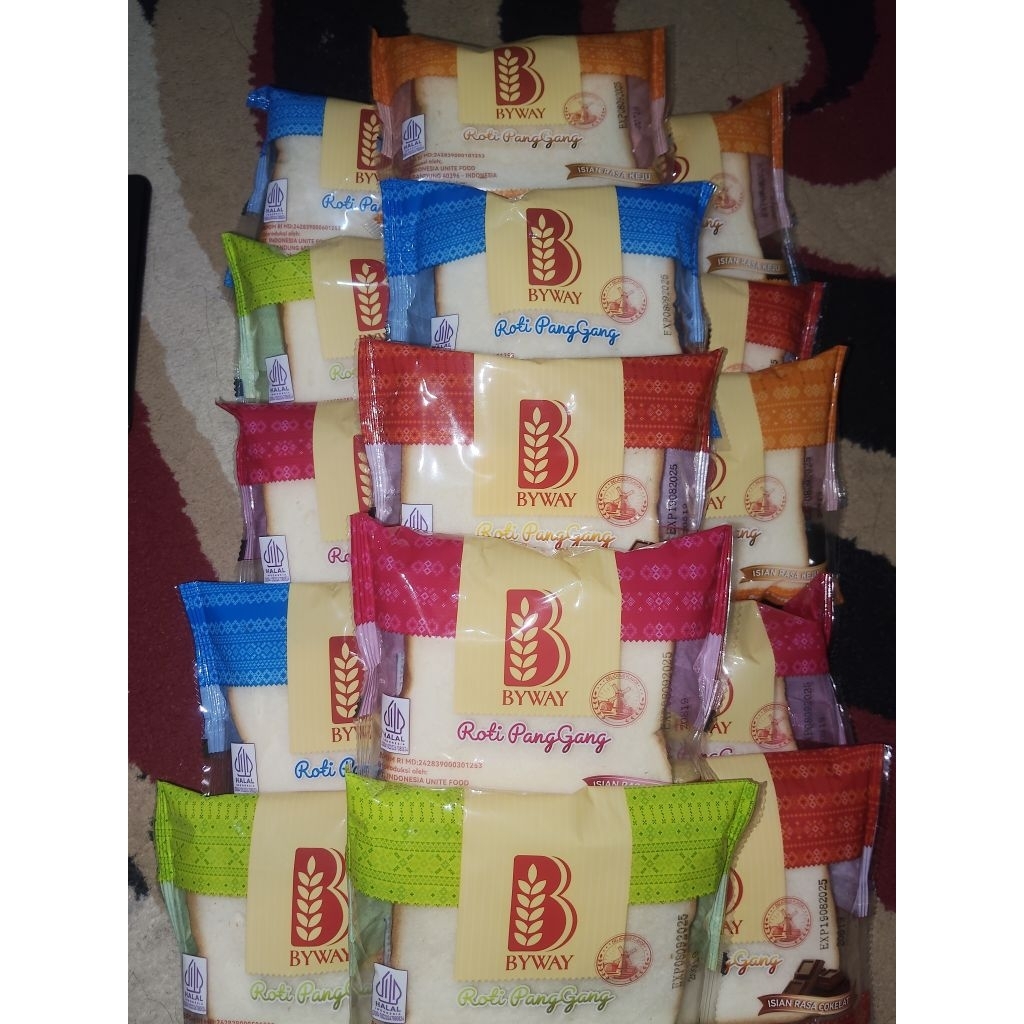 Foto tersebut menampilkan beberapa bungkus roti panggang merek BYWAY yang ditata rapi dan beragam warna kemasannya. Warna-warna kemasan meliputi: