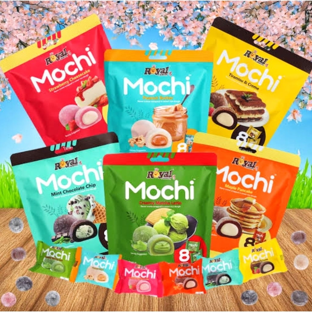mochi merek Royal, sebuah jenis makanan penutup Jepang yang terbuat dari kue beras ketan. Mochi ini dikenal dengan teksturnya yang kenyal dan isiannya yang manis.