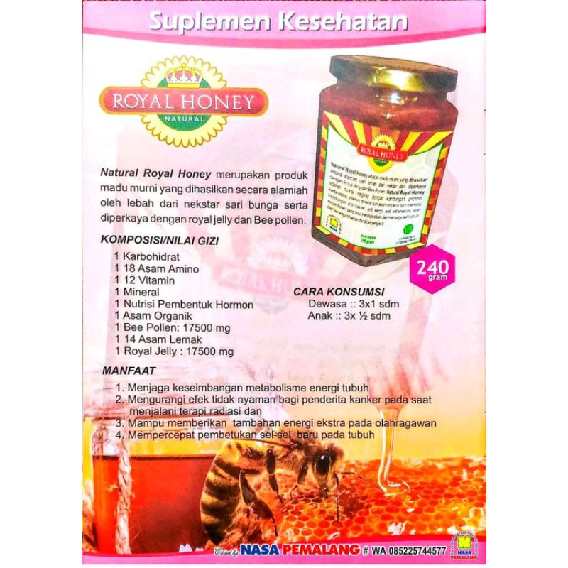 NATURAL ROYAL HONEY NASA . Natural Royal Honey Nasa, manfaat madu untuk kesehatan dan ibu hamil . . . . Natural royal honey adalah madu alami yang di hasilkan oleh lebah pekerja dari nektar dan diperkaya Royal Jelly dan Bee Pollen. . Natural Royal Honey merupakan suplemen yang memiliki nutrisi lengkap yang di proses dari extrasi sarang lebah, natural royal honey mengandung asam amino, asam organik, vitamin, mineral, karbohidrat, hormon, antioksidan, senyawa anti mikroba, senyawa anti bakteri, anti radang dan senyawa-senyawa lainnya yang bekerja secara sinergis untuk menciptakan keseimbangan nutrisi. . . Manfaat madu bagi kesehatan tubuh kita :: Mencegah diabetes ( pengganti gula ). Mencegah kanker dan penyakit jantung. Meningkatkan kesuburan suami dan istri. Meningkatkan stamina. Meningkatkan daya ingat. Menghilangkan alergi. Melawan bakteri jahat. Meningkatkan metabolisme tubuh. Mencegah tumor di berbagai bagian tubuh. Mencegah sakit perut. Mencegah stress. Mencegah penyakit alzeimer. . Manfaat madu untuk wajah :: Mencerahkan kulit wajah. Membantu menghilangkan flek hitam bekas luka. Mengecilkan pori-pori kulit. Menghilangkan bekas jerawat Menjadikan kulit wajah lembut dan putih bersinar, sangat baik di gunakan untuk masker dapat digunakan untuk membersihkan kulit dari radikal bebas. . Manfaat madu untuk ibu hamil :: Madu kaya akan nutrisi yang baik untuk di konsumsi ibu hamil. Madu melancarkan BAB pada ibu hamil. Menambah nafsu makan ibu hamil. Menambah tenaga dan menjaga daya tahan tubuh selama hamil. Menguatkan janin. Membantu janin di dalam kandungan tubuh normal dan sehat. Mencegah terjadinya penyakit hepatitis B pada janin kelak. Mencegah mual-mual saat hamil. Vitamin C yang terkandung pada madu sangat bagus untuk ibu hamil efektif memberi kecerahan dan kesegaran. . . Yuuk cepat list pesenanmu sebelum kehabisan, stock terbatas... . ========== #madu#maduherbal#madusehat#maduibuhami#maduherba#maduasli