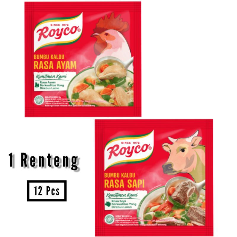 Royco bumbu kaldu ayam/sapi merupakan produk Unilever yang sudah ada sejak 1972 dengan rasa ayam dan rasa sapi berkualitas yang direbus lama, cocok digunakan sebagai bumbu instan untuk berbagai menu sajian yang nikmat.