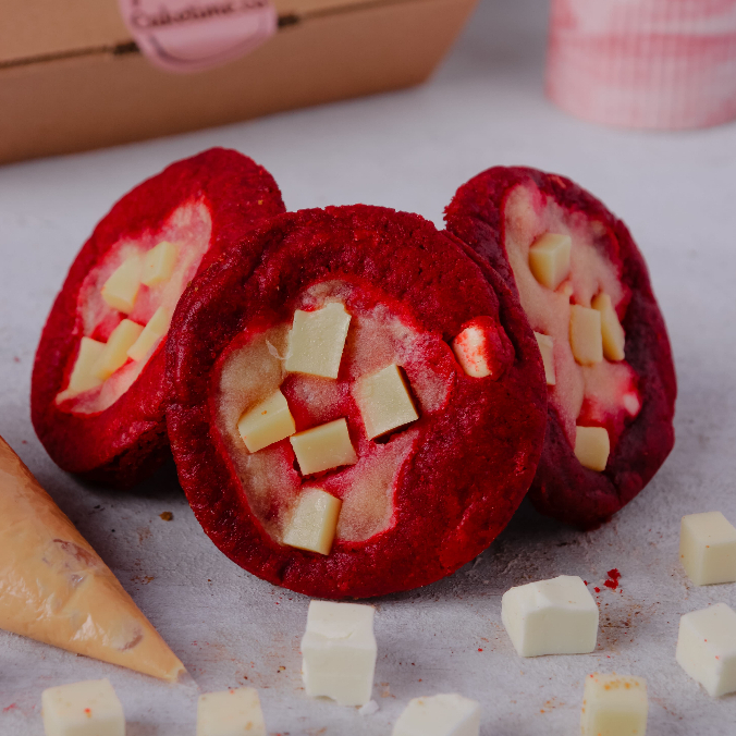 RV Double Cheese Cookie: Red velvet brown butter, white chocolate, cream cheese, diced cheddar cheese