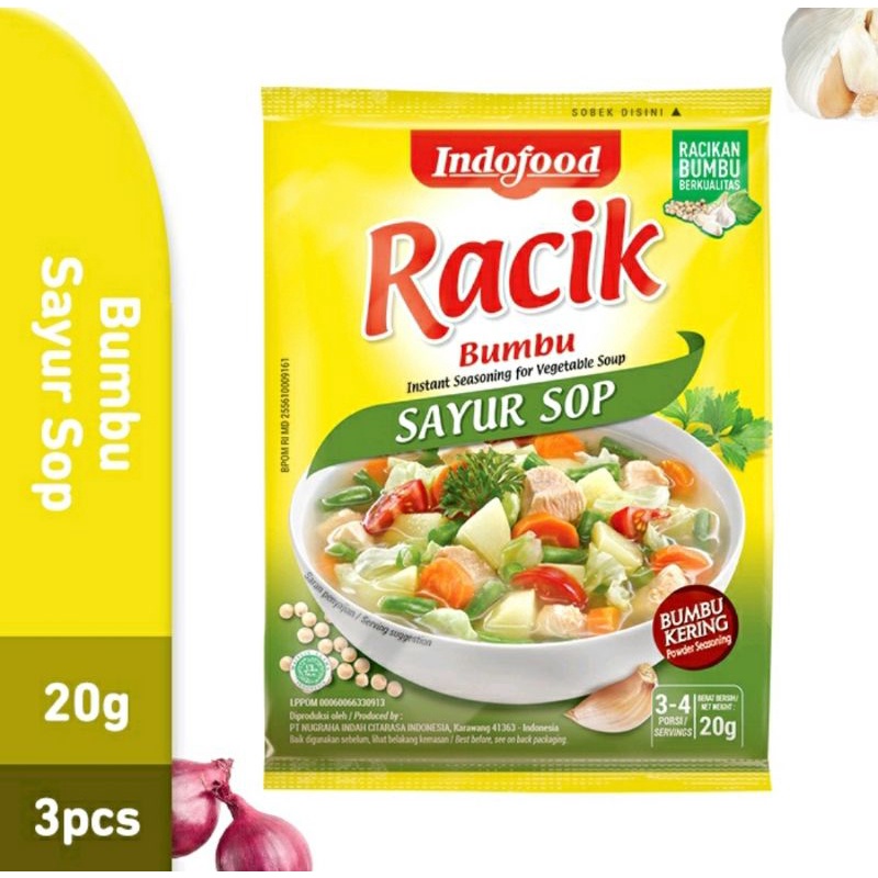 1 bungkus Bumbu RACIK Sayur Sop cukup untuk 1x masak untuk 3-4 porsi. Cocok untuk aneka jenis sop seperti sop ayam, sop jagung, sop makaroni, dan kreasi sop favorit keluarga.