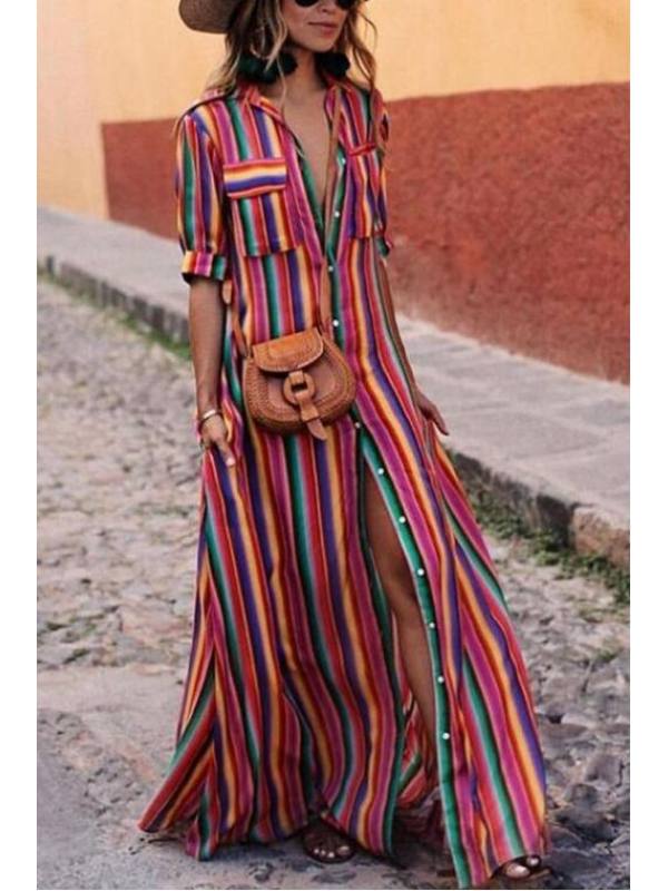 maxi dresses,rainbow stripe button through roll up sleeve half sleeve boho maxi dresses