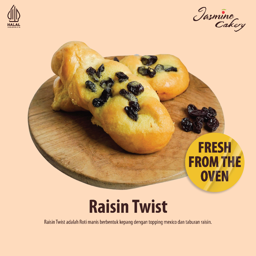 Salah satu varian roti yang digemari oleh Sahabat Jasmine adalah Raisin Twist. Raisin Twist adalah Roti manis berbentuk kepang dengan topping mexico dan taburan raisin.