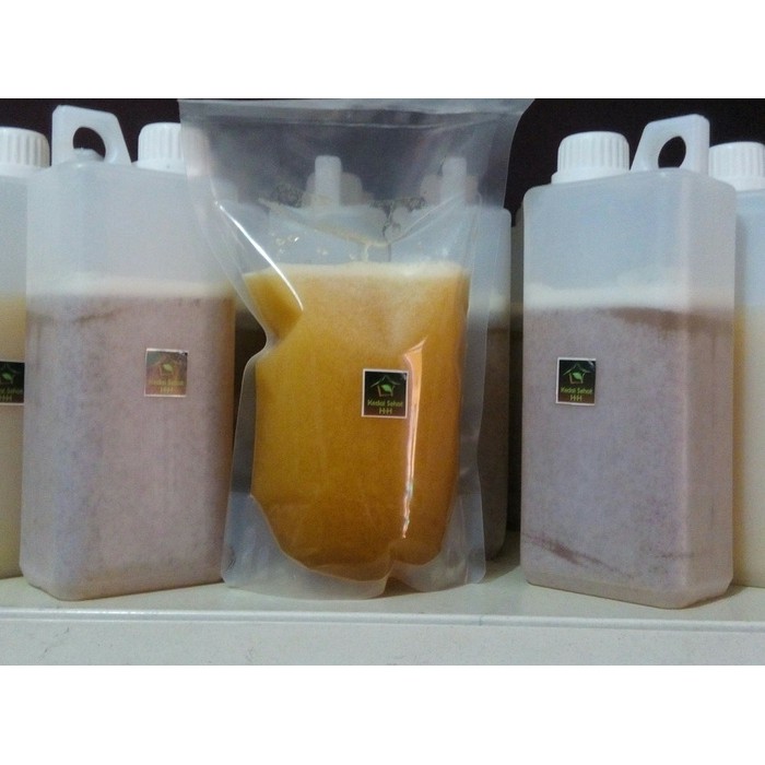 Botol madu telah dirangkap dengan plastik tebal food grade guna menampung bila