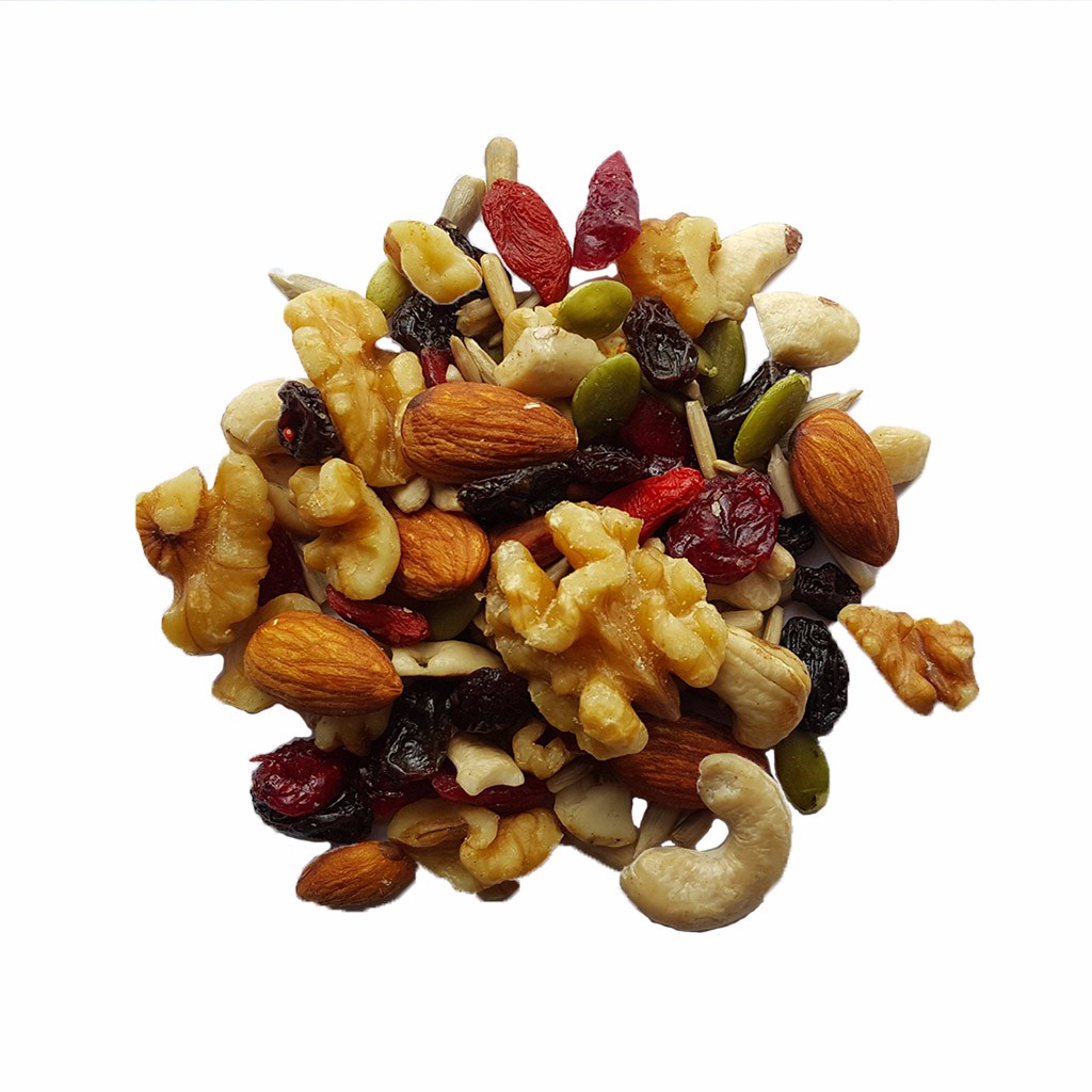 Almond, Cashew, Walnut, Cranberry, Raisin Pumpkin Seeds, Sunflower dan Goji Berry.